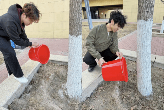 在实践环节,体育系学子聚焦“护绿校园”开展志愿服务。同学们分工协作,手提红色水桶穿梭于校园行道树之间,为树木逐一浇水养护,用点滴行动守护校园绿意,以实际行动践行“爱护环境、服务校园”的志愿理念。