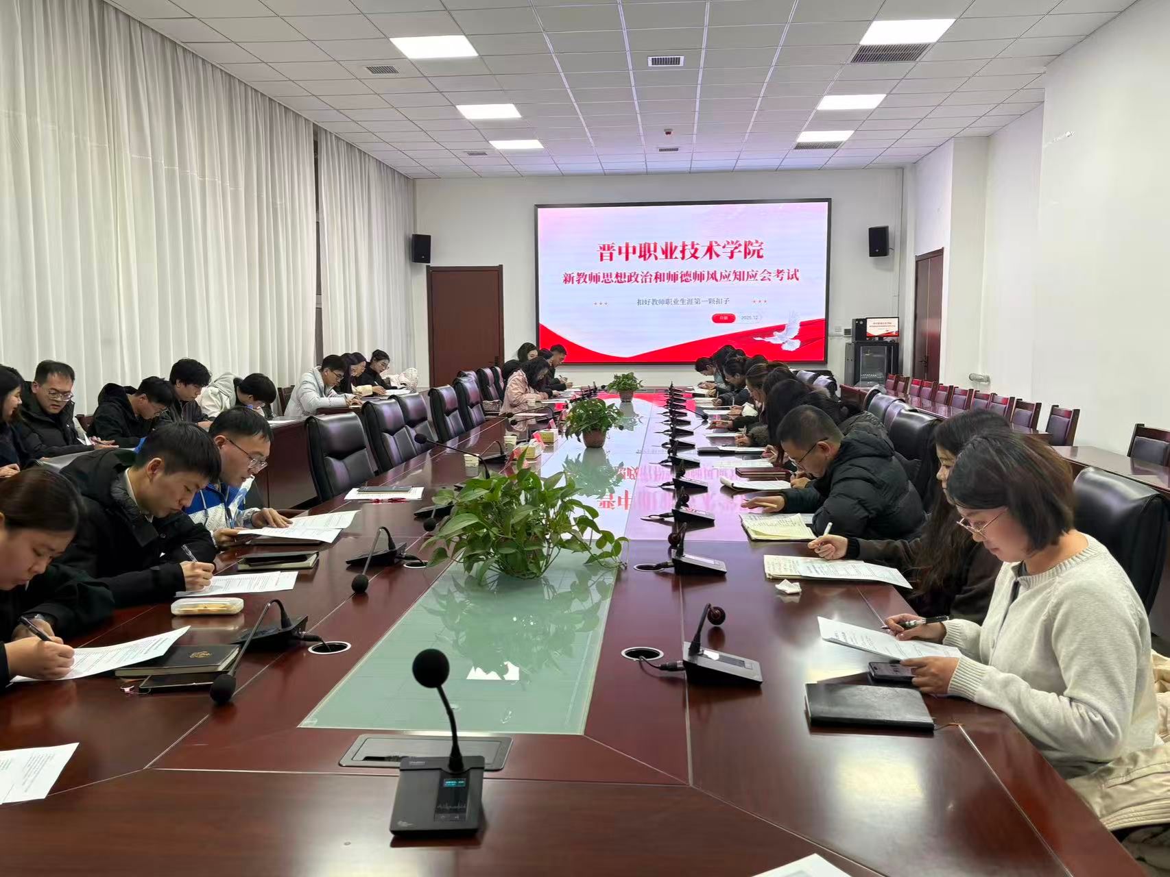 12月16日,我校2025年新入职教师宣誓及师德师风应知应会考试活动在行政楼A101会议室顺利开展。这场集警示教育、经验分享、入职宣誓与师德师风考试于一体的活动,为新聘教师们送上了入职“第一课”,引导大家坚定教育初心、恪守师德规范,以饱满姿态奔赴教育新征程。