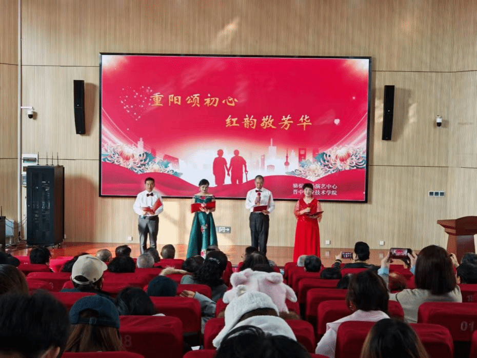 随后,学院退休教职工代表与骆驼广场演艺中心共同为老同志们呈献了一场以“重阳颂初心 红韵敬芳华”为主题的文化盛宴。文艺节目精彩不断,翩跹的舞蹈展现岁月风采,激昂的朗诵抒发家国情怀,诙谐的小品传递真挚温情,悠扬婉转的歌曲更添韵味。一个个精心编排的节目接连登场,最动人的篇章由 87 岁高龄的老党员书写。他精神矍铄、步履稳健,接过话筒便引吭高歌,熟悉旋律在大厅激荡,苍劲歌声里既有岁月沉淀的醇厚,更有“离岗不离党”的执着。终场时,全场师生高声齐唱《歌唱祖国》,旋律中听见了初心回响,在家国情怀的共鸣中,老同志们切实感受到了“回家”的温暖与学院的关怀。