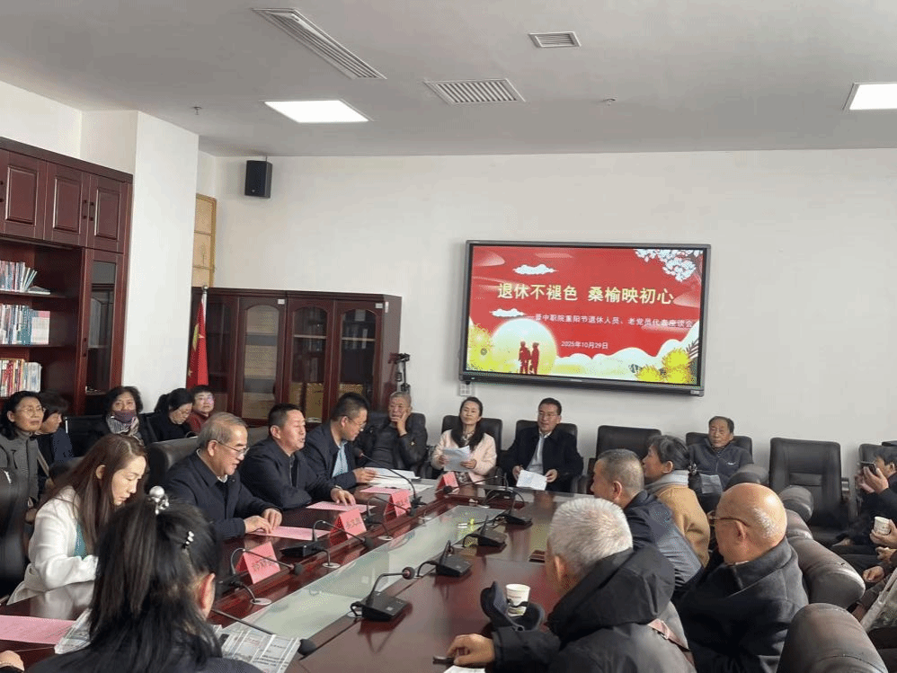 义诊结束后在二层会议室里,隆重举行“退休不褪色 桑榆映初心”重阳节座谈会。院领导与退休教职工、老党员代表欢聚一堂,忆往昔峥嵘岁月,话今朝职教发展。