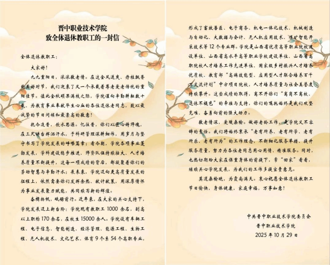 九九重阳日,浓浓敬老情。金秋时节,丹桂飘香,九九重阳节如期而至。10月29日上午,晋中职业技术学院精心策划并举办了以“退休不褪色 桑榆映初心”为主题的重阳节系列活动。为退休教职工呈献了一场兼具温度与深度的重阳盛宴。