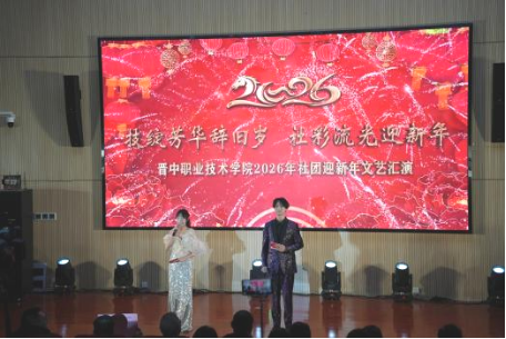 岁序更替,华章日新。12月22日,晋中职业技术学院公共教学楼东三层报告厅灯光璀璨、暖意融融,2026年社团迎新年文艺汇演在此隆重上演。院党委书记、党委委员、副院长,党委委员、宣传统战部部长,党委委员、组织人事部部长等院领导及各系部处室领导,与社团指导教师、学生欢聚一堂,在歌舞与欢笑中定格青春记忆,共赴新年之约。本次晚会以“技绽芳华辞旧岁 社彩流光迎新年”为主题,既是社团文化成果的集中展示,更是学院“修德、积学、精技、善行”院训精神的生动诠释。