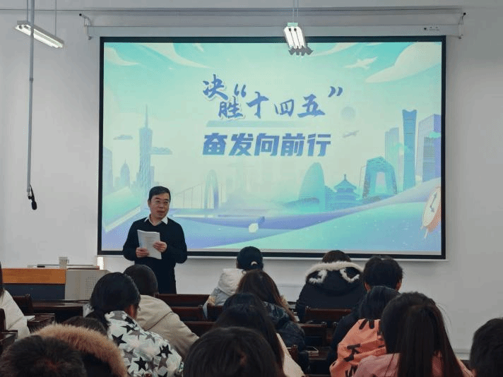 课堂上,常兴旺副院长围绕“‘十四五’收官之年的使命与青年担当”展开,系统回顾了“十四五”期间我国在经济、民生、生态等领域取得的成就:国内生产总值稳步增长、居民收入持续增加、“绿水青山”理念深入人心,创新引擎更加强劲等,实质性展现了我国在高质量发展阶段的扎实进展。接着,他阐释了“十四五”与“十五五”衔接的重要意义,强调当前正处于“十四五”收官攻坚与“十五五”前瞻布局的关键节点,应将“十四五”时期积累的经验启示继续融入到“十五五”规划中,同时指出经济管理系同学更要在现代化产业体系、科技攻关、绿色转型等国家急需领域发挥专业与创新力量。最后,他勉励同学们把握科技革命机遇,将个人学业融入国家发展大局,以实际行动为中国式现代化建设注入青春动能。