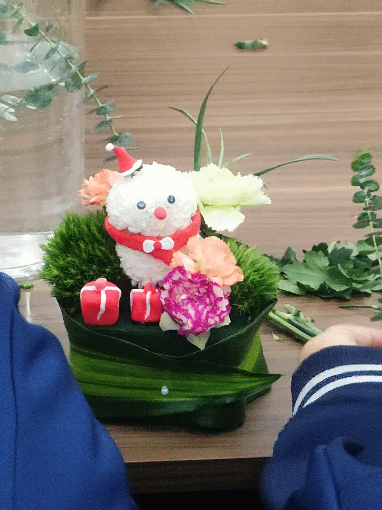 活动伊始,同学们有序落座花艺室,刘老师以风趣鲜活的讲解拉开课堂序幕,瞬间点燃大家的参与热情。恰逢冬至将至,作为岁寒时节的重要节点,刘老师巧妙设定“雪人”为创作主题,既贴合节气特色,又暗藏童趣巧思,让同学们满怀期待投入这场花艺创作之旅。
