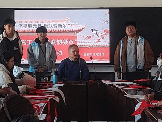 为传承中华优秀传统文化,沉浸式感受对联艺术的独特魅力,在2026年元旦来临之际,生物工程系于2025年12月29日在A315教室成功举办“联韵凝章”写对联活动。本次活动以“笔墨传情迎元旦,对联送福贺新岁”为主题,面向全系学生开展,旨在搭建传统文化实践平台,营造温馨祥和的节日氛围,增进师生情感与集体凝聚力。