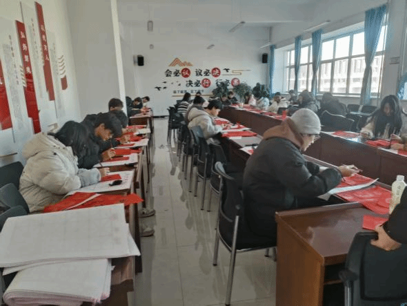 活动现场红纸铺展、墨香萦绕。同学们围绕元旦主题进行个人创作,或凝神构思,或挥毫书写,将对新年的祝福融入字里行间。作品既有“一元复始山河秀,万象更新锦绣春”等传统佳对,也不乏如“生物逐梦新程启,工程扬帆岁月新”等体现专业特色的原创对联,充分展现了对联的格律之美与学生的文化创意。整个创作过程秩序井然,工作人员全程引导,确保活动安全、规范进行。